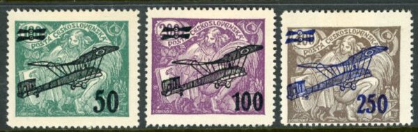 Czechoslovakia: 1922 (15 June). Surcharged airmail mint o.g. set of 3. Sg. 224/226 *