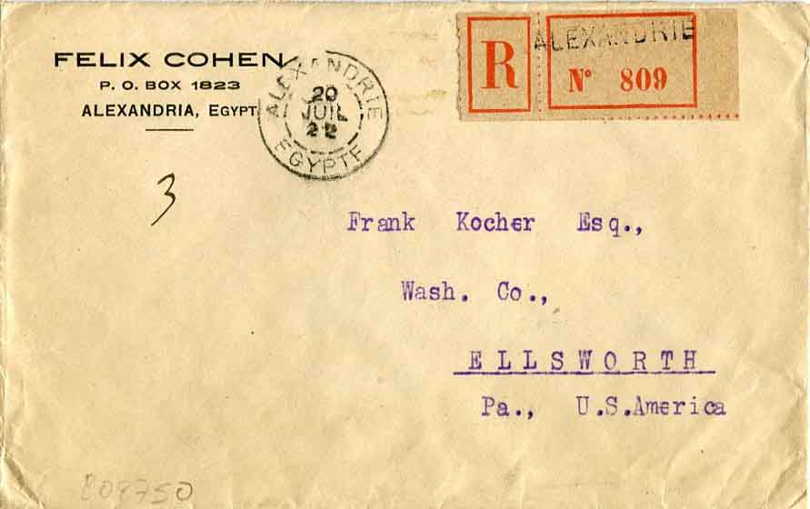 1922 Egypt Alexandria French PO Cover to USA