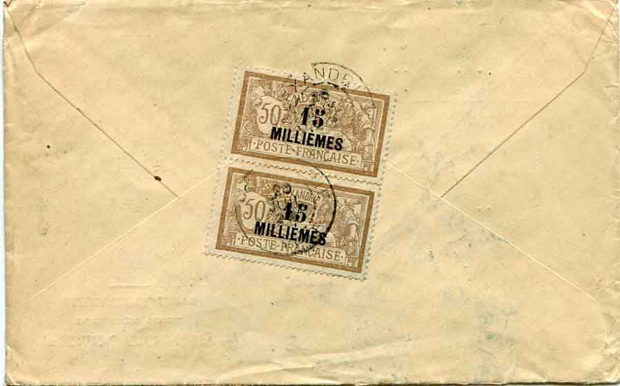 Egypt: 1922 (20 July). Registered cover to Ellsworth, United States franked with French Post Office in Alexandria surcharged at Paris pair of 15m on 50c tied by Alexandrie Egypte datestamps. Sg. 61