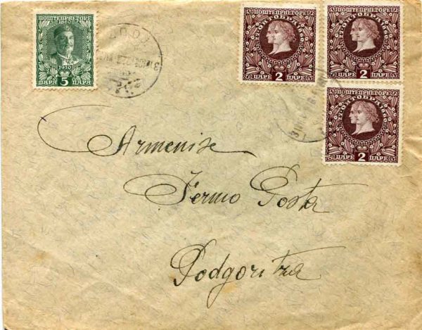 Montenegro: 1912 (31 October). Philatelically inspired cover from Tuzi to Podgorica franked with three 2pa and 5pa of Kingdom issue tied by Ottoman type bilingual TUZ – TOUZ datestamps. Reverse no postal markings. Rare !
