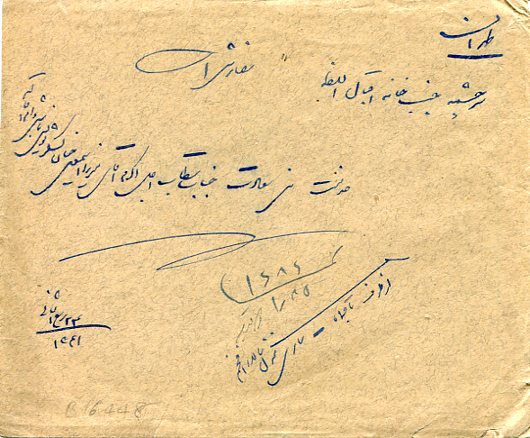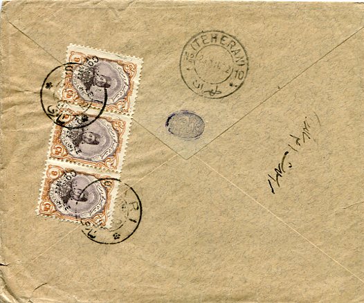 Iran: 1922 (17 July). Cover to Tehran franked with strip of three 9ch Ahmed Mirza stamps tied by SARI datestamps and Teheran arrival cds.