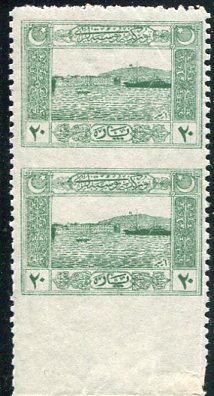 Turkey: 1922 (Jan). Genoa print commemorative issue 20pa Izmir Harbour design unmounted mint bottom marginal imperf. between pair. Isfila 1080DE17. **