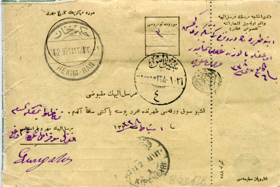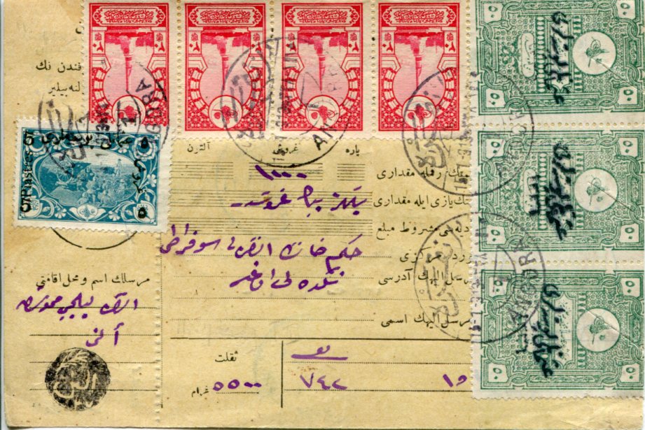 Turkey – Anatolian Government: 1922 (15 January). Money Order to Hekimhan franked with “Osmanli Postalari 1336” handstamped strip of three 50pi Religious Tribunal revenue stamp (folded over), strip of four 20pa and 5pi on 2pi Ottoman pictorials tied by Ankara – Angora 1 datestamps. Reverse 20 January KIRSEHRI – KIRCHEHIR (A&P type 6, RR) and 26 January SIVAS 4 (A&P type 13, RR) transit and 1 February HEKIM-HAN (A&P type 2, RR) arrival cds’s. Isfila 968