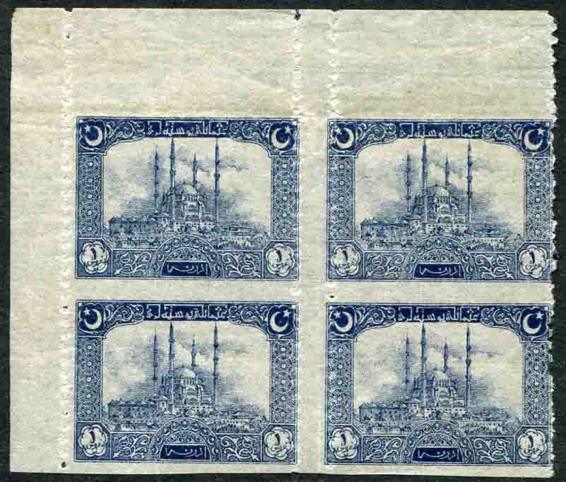 Turkey: 1922 (Jan). Genoa print commemorative issue 1k Edirne Selimiye Mosque design mint o.g. partly imperforate corner marginal block of 4 with vertically double perforation error. *
