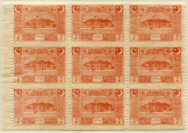 Anatolian Government: 1922 (January). First Parliament House, Ankara 20pa unmounted mint block of nine with imperforate between and top & bottom variety. Probably the largest multiple of this variety recorded. Isfila 1098DE17. **