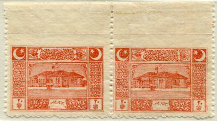 Anatolian Government: 1922 (January). First Parliament House, Ankara 20pa unmounted mint horizontal pair with imperforate top margin variety. Isfila 1098DE65. **