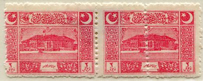 Anatolian Government: 1922 (January). First Parliament House, Ankara 3pi thick paper mint o.g. horizontal pair one with perforation through middle of the stamp variety. Unrecorded by the specialised catalogue. *