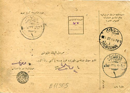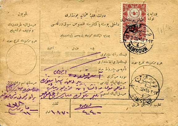 Turkey – Anatolian Government: 1922 (12 March). Parcel Card to Aşkale franked with ‘Osmanli Postalari 1337’ 1pi surcharged on 1pi Ottoman Hejaz Railway Fiscal stamp tied by Samsun – Samsoun 4 (A&P type 20) datestamps. Reverse 16 March Trabzon – Trebizonde, 1 April Erzurum 1 transit and same day AŞKALE 1 (vilayet Erzurum, A&P type 2, RR) arrival cds’s. Isfila 1038