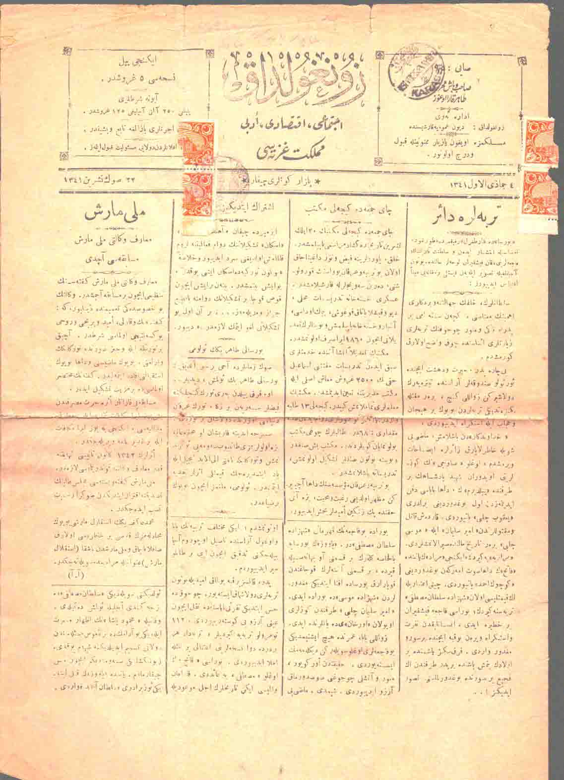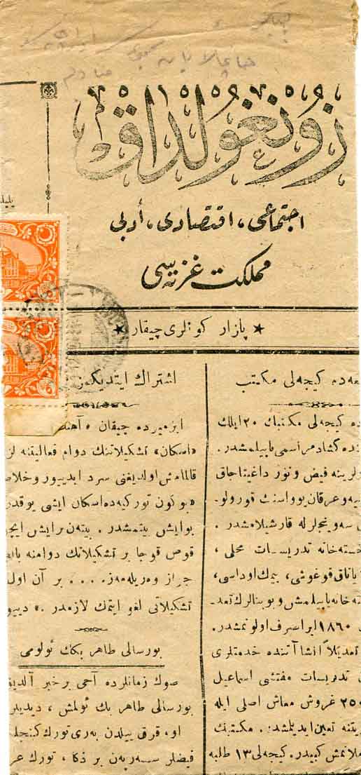 Ottoman Turkey: 23 December 1922 dated four pages newspaper called ZONGULDAK to Balikesir franked with pair of 5pa of 1917 pictorial and tied by Zonguldak datestamp and KARASSI 2 (unrecorded by A&P) arrival cds. approx. 285 x 430mm.