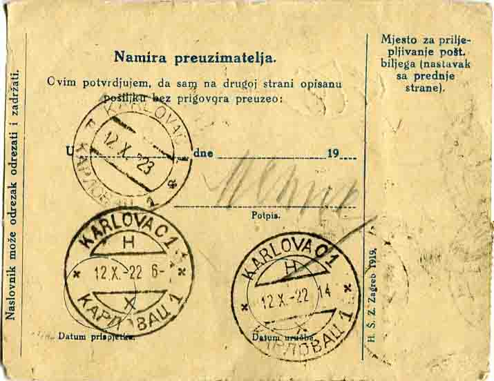 1922 Yugoslavia Zagreb Karlovac Parcel Card