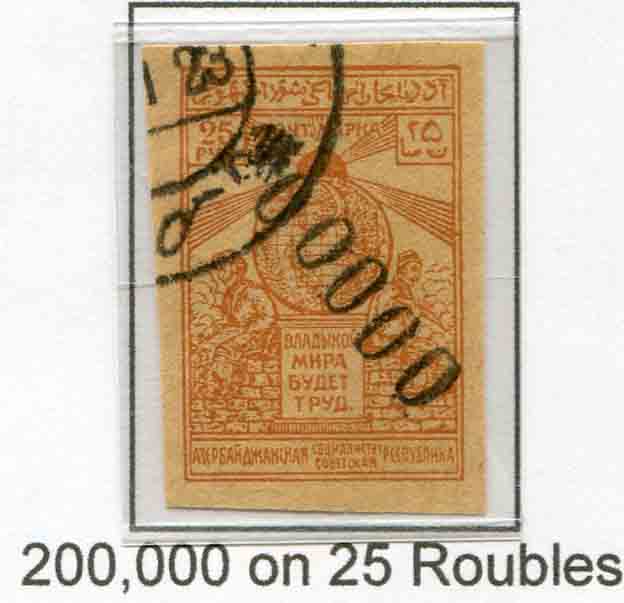 Azerbaijan: 1922-23 second enumerator surcharged issue 200,000r on 25r fine used. Scott 49