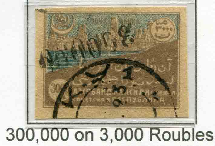 Azerbaijan: 1922-23 second enumerator surcharged issue 300,000r on 3,000r fine used. Scott 50