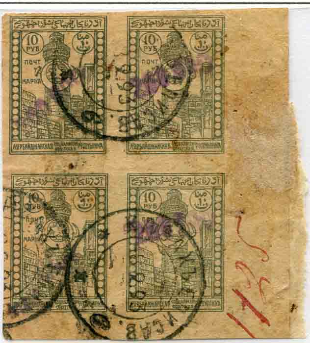 Azerbaijan – Transcaucasian Socialist Federative Soviet Republic: 1922-23 Handstamped from settings of Rubber Type in violet imperforate marginal block of four 200,000r surcharged on 10r struck by KAZAKH ELISAV “v” 08.09.23 datestamps. Very scarce. Sc. 67