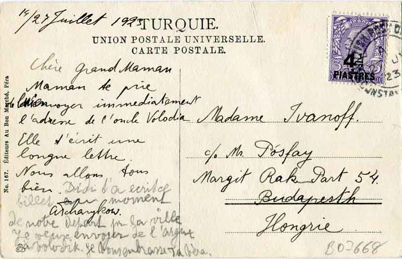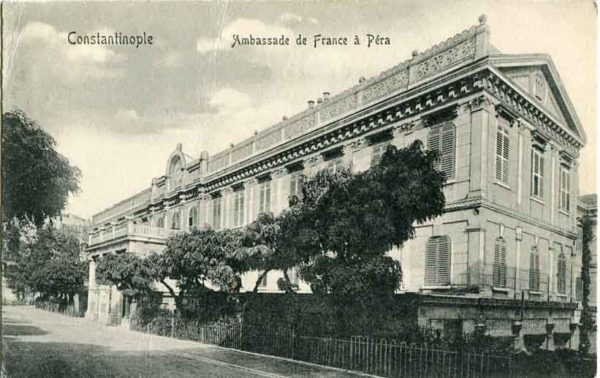 British Levant: 1923 (27 July). Picture postcard of French Embassy in Pera, Istanbul (ed. Bon Marche #167) to Hungary franked with 4 1/2pi surcharged on 3d and tied by BPO Constantinople datestamp.