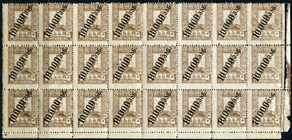 Georgia – Transcaucasian Federation: 1923 surcharged in Transcaucasian roubles 10,000r on 1000r machine print unmounted mint marginal block of 24. Some seperation. Sg. 42