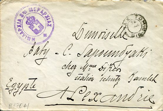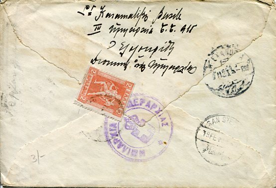 Greece: 1923 cover from Greek Lieutenant to Egypt franked with 2d tied by illegible datestamps, black TT.915 and violet circular censor cachets, Alexandria transit and 19 February San Stefano arrival cds’s.