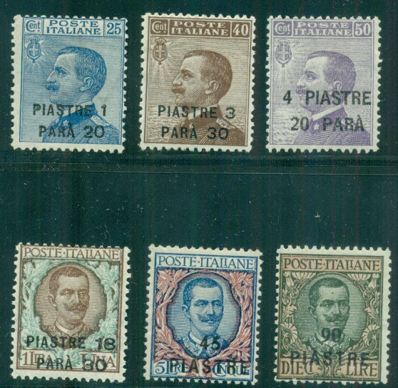 Italian Levant: 1923 Stamps of 1901-20 surcharged locally with COSTANTINOPOLI omitted unissued values to 90pi. All lightly hinged mint with top four values expert cachet on reverse. Very scarce.