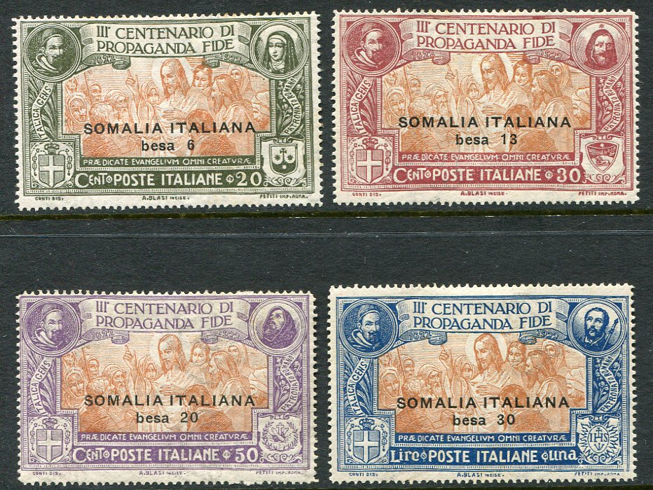 Somalia – Italian Occupation: 1923 (24 October). “Propaganda Fide” stamps of Italy surcharged with Besa values mint o.g. set. Top two values have discoloured gum. Sg. 44/47. *