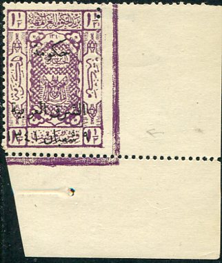 Jordan: 1923 (April). Arab Government of the East, 9 Shaban overprinted Hejaz stamps 1 1/2pi lilac mint o.g. corner with one side imperf variety. Signed on reverse. Sg. 92 (d)