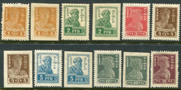 Russia – Soviet: 1923 (May). Worker, Soldier and Peasant unmounted mint perforated, imperforate and unissued values unmounted mint values. Mi. XIIIB, XIVB, 215A, 216A,C, 217A,C, 218A,C, 219A – Sg. 320/324, 321a, 322a, 323a +. **
