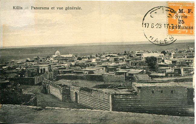 Syria: 1923 (17 June). Picture postcard of Kilis (Turkey) franked with OMF Syrie overprinted 25c on 5c tied by Haleb datestamp. Reverse blank. Sg. 95