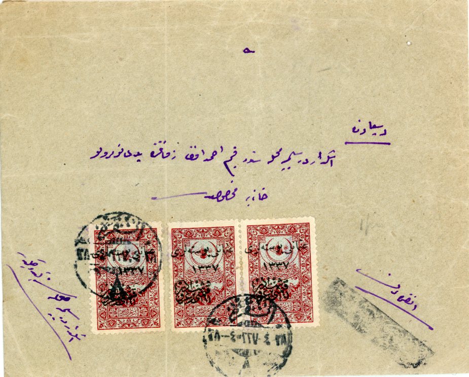Türkiye: 1923 (4 February). Field Post Office cover from Staff Major Fevzi of the Operations Branch at Balikesir to Istanbul franked with 20pa, 60pa on 10pa and 3pi to make up five piasters internal letter rate tied by Sahra Postasi 36 datestamps and 8 February Erenkoy arrival cds. Field Post Office documents from the Anatolian Government period is very scarce.