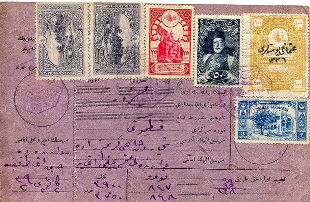 Turkey – Anatolian Government: 1923 (2 January). Money order to Kastamonu franked with type I ‘Osmanli Postalari 1336’ handstamped 100pi orange-brown Ottoman Religious Tribunals revenue, 3pi, two 10pi, 25pi and 50pi Ottoman pictorial postage stamps tied by Darende 1 (vilayet Sivas, A&P type 2 – R) octagonal datestamps. Stamps slitted as required by the authorities. Reverse 11 January Sivas 4 (A&P type 13 – RR), 17 January Merzifon – Merzifoun 1 (A&P type 6 – R) transit and 22 January arrival cds’s. Only 1,700 handstamped. Sg. A21, Isfila 716, 719, 937, 939, 970