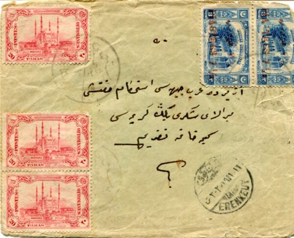 Ottoman Turkey – Anatolian Government: 1923 (11 January). Cover to Izmir franked with pair of 7 1/2pi surcharged in brick on 3pi (one trimmed on top) and three 20pa Ottoman stamps for five piastres postage and 11pi10pa for quadruple weight (over franked 10pa) rate tied by POSTA BEIYE SUBESI 42 (TR3014, A&P type 123, R) handstamps and Erenköy dispatch datestamp. Reverse 15 January Sahra Postasi 45 (FPO) transit and 24 January arrival cds’s. Beiye cancellations used on covers from the post boxes by the shops where people would be able to buy postage stamps before posting them.