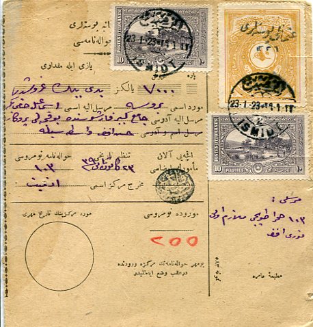 Turkey – Anatolian Government: 1923 (23 January). Money order franked with type III ‘Osmanli Postalari 1336’ handstamped 50pi yellow-brown Ottoman Ministry of Justice Tribunals revenue and two 10pi Ottoman pictorial postage stamps tied by Izmit – Ismidt 2 (A&P type 11) bilingual datestamps and slitted as required by the authorities. Reverse no postal markings. Sg. A28, Isfila 939, 977