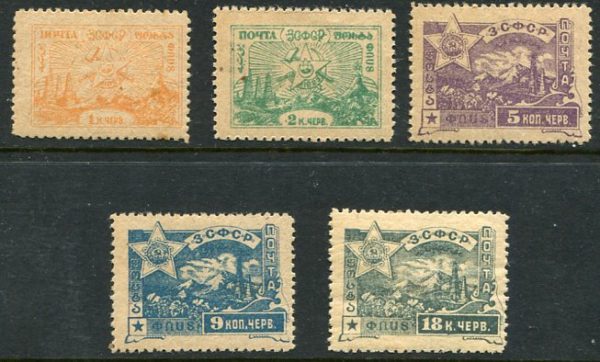 Azerbaijan – Transcaucasian Socialist Federative Soviet Republic: 1923 (24 October). Oil Fields and Soviet symbol pictorial set in Gold Kopecks (chevronetz) mint o.g. values to 18k. Sc. 25, 26, 29/31