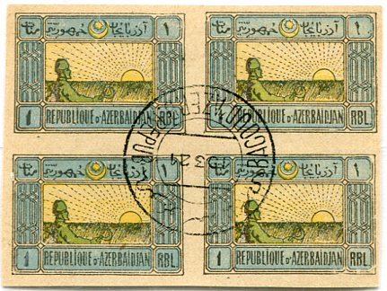 Azerbaijan Democratic Republic: A block of four imperf 1r forgery struck with 19.3.24 BACOUD AZERB REPUB bilingual forge datestamp.