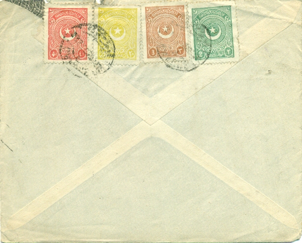 Turkey: 1924 commercial cover from Izmir to England franked on reverse with star&crescent issues of 1923 and tied by SMYRNE date stamps. Top part has a long tear.