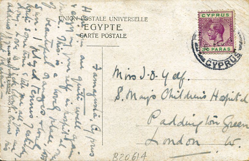 Cyprus: 1924 (6 February). Postcard to England franked with 30pa KGV definitive tied by Famagusta datestamp.
