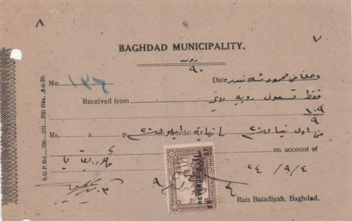 Iraq: 1924 Baghdad Municipality document franked with 1an revenue stamp. Ross & Powell 106