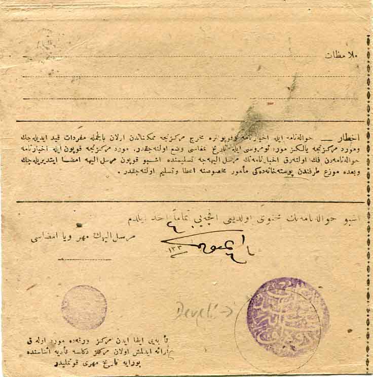 Turkey: 1924 (19 July). Parcel card franked with 3pi Ottoman and 15pi Republic stamps tied by octagonal SMYRNE 12 datestamp and on arrival struck by superb TELGRAF ve POSTAHANE-I DEVELU 1321 (vilayet Ankara, A&P type 2, R) negative seal also repeated on reverse.