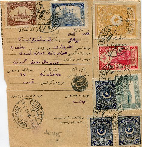 Turkey: 1924 (25 June). Money Order to Adapazari franked with 25pi Ottoman pictorial, 20pa, 1pi and 50pi overprinted revenue Anatolian Government, three 7 1/2pi Republic of Turkey and 1pi Red Crescent charity stamps tied by Kandra (sandjak Izmid, A&P type 5, RR) datestamps and next day arrival cds. Fascinating combination of three administration issues on one document.