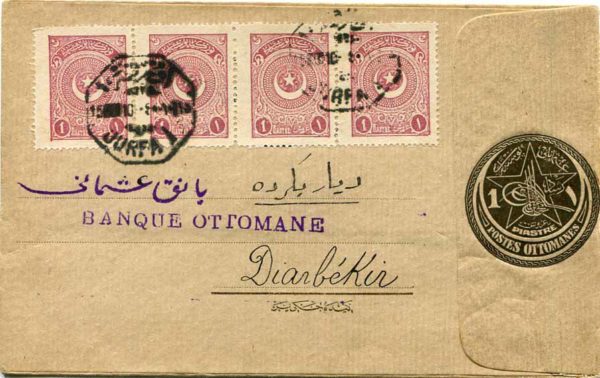 Turkey: 1924 (15 October). Ottoman 1pi postal stationery envelope to Diyarbakir with additional strip of 1pi first printing star & crescent definitive stamps of Anatolian Government for five piastres internal letter rate tied by Urfa – Ourfa 1 (A&P type 7 – R) bilingual datestamp and on reverse 18 October arrival cds. Isfila 1111