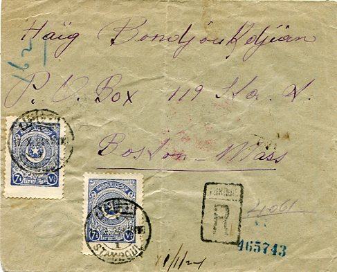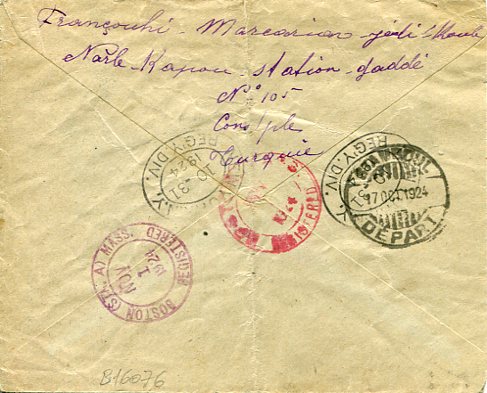 Turkey: 1924 (17 October). Registered cover to United States franked with two 7 1/2pi of second printing star & crescent definitive stamps for 7 1/2pi single weight foreign letter and 7 1/2pi registration rate tied by Stamboul 1 datestamps. Reverse same day dispatch, 31 October New York and next day Boston arrival cds’s.
