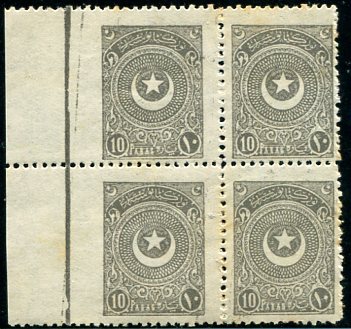 Turkey: 1924 Second Star & Crescent definitive issue on thick paper 10pa grey part imperf. unmounted mint marginal block of 4. Some foxing on reverse. Burak 939Ku, Mi. 826a, Sg. 994