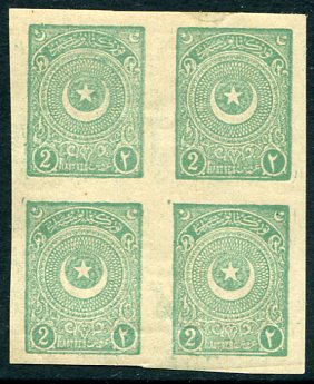 Turkey: 1924 Second Star & Crescent definitive issue on thick paper 2pi blue-green mint o.g. imperf. block of four. Burak 942U, Mi. 829U, Sg. 998a