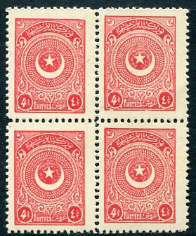 Turkey: 1924 Second Star & Crescent definitive issue on thick paper 4 1/2pi carmine unmounted mint block of four. Burak 945, Mi. 831, Sg. 1001