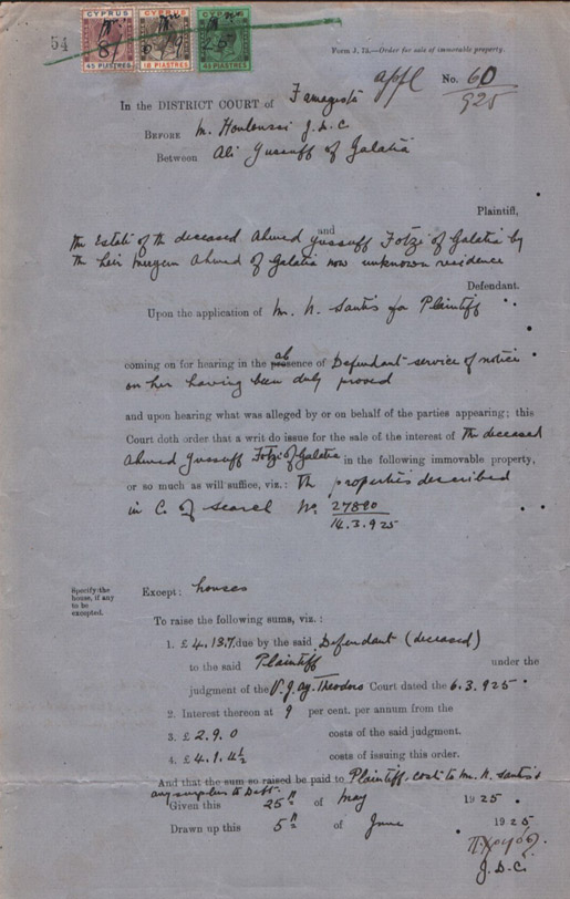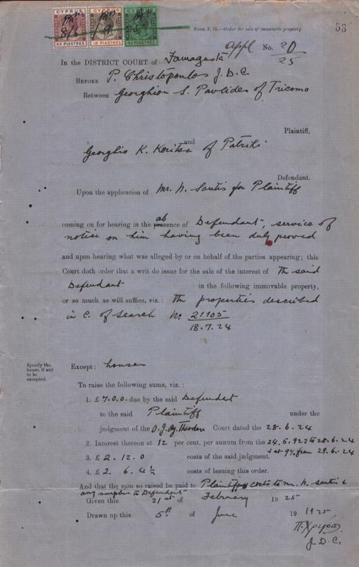 Cyprus: 1925 Famagusta District Court two sided document franked with 4 1/2pi, 18pi and 45pi KGV stamps on each side. Sg. 111, 115, 116