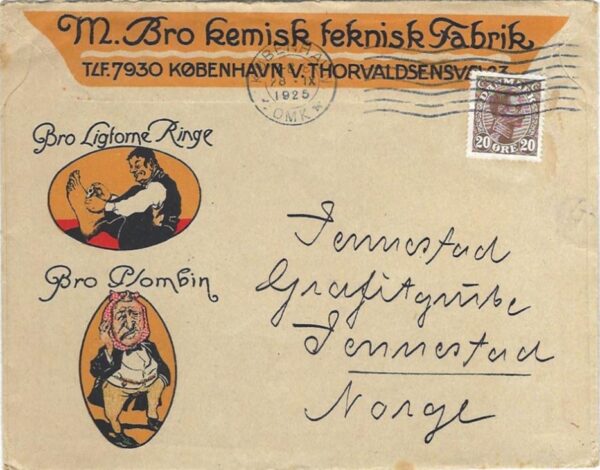 Denmark: 1925 fine colour illustrated advertising company envelope with images on front for feet and teeth issues, full colour image on reverse of the Bro company creams, also with enclosed letter. Fine and attractive.