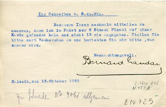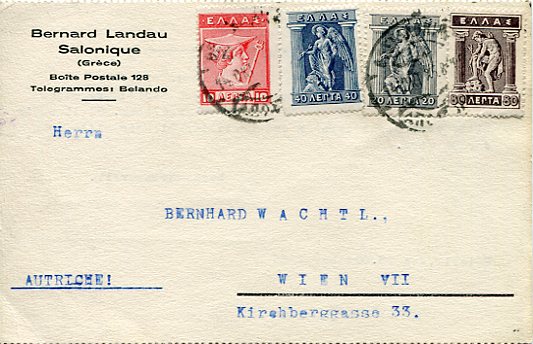 Greece: 1925 (13 October). Commercial private formular stationery card to Austria franked with various definitive stamps including scarce 40l lithographic issue tied by Thessaloniki datestamps. Hellas 227A.