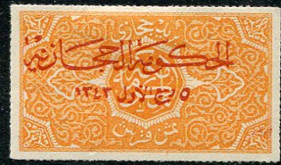 Hejaz: 1925. “Hejaz Government, 4th October, 1343 (1924)” overprinted red on 1/8pi orange-yellow roul 20 mint o.g. Mi. 49a, Sg. 59