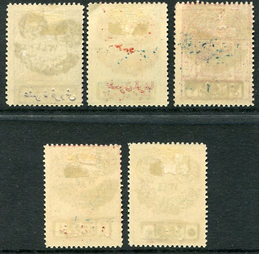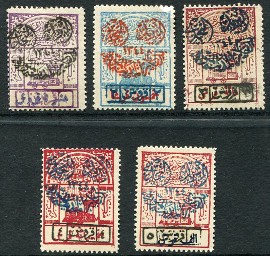Nejdi Occupation of Hejaz: 1925 (5 December). Hejaz Railway Tax stamps handstamped ‘Postage of Nejd, 1344, Commemoration of Medina’ mint o.g. complete set of five. Sg. 244/248