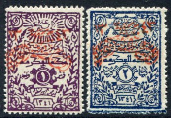 Nejdi Occupation of Hejaz: 1925 (March). Nejd Sultanate Post overprinted on Notarial Fiscal stamps unmounted mint set. Mi. 10a/11a, Sg. 192/193. **