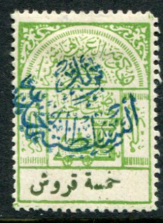 Nejdi Occupation of Hejaz: 1925 (July-August). Nejd Sultanate Post handstamp in blue on mint o.g. 5pi Hejaz Railway Tax stamp. Sg. 221 *