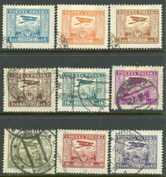 Poland: 1925 (10 September). LVG Schneider Biplane airmail used set. Sg. 252/260