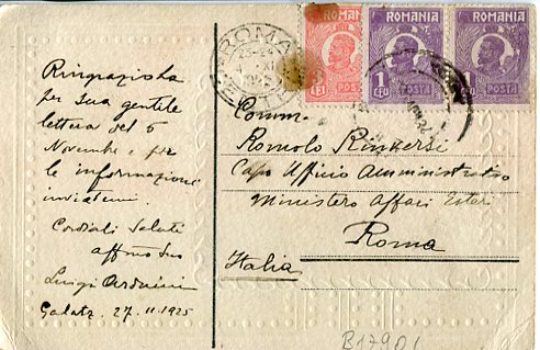 Romania: 1925 (28 November). Postcard titled ‘Galati. Docurile (vapoare la incarcare)’ to Italy franked with pair of 1l and 3l tied by distapch and 4 December Roma arrival cds’s.